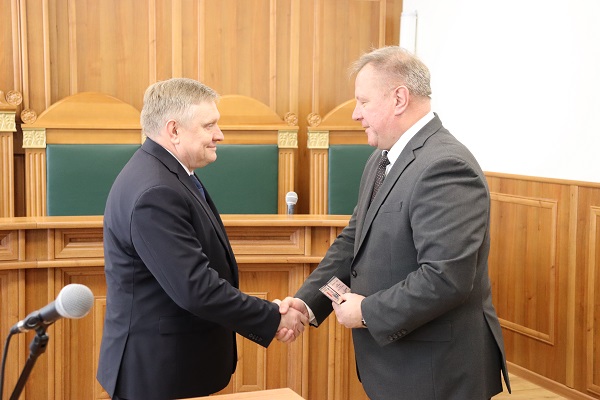| Главный федеральный инспектор по Мурманской области Калинин А.Н. вручил удостоверение председателю суда Басову А.И. | версия для печати |